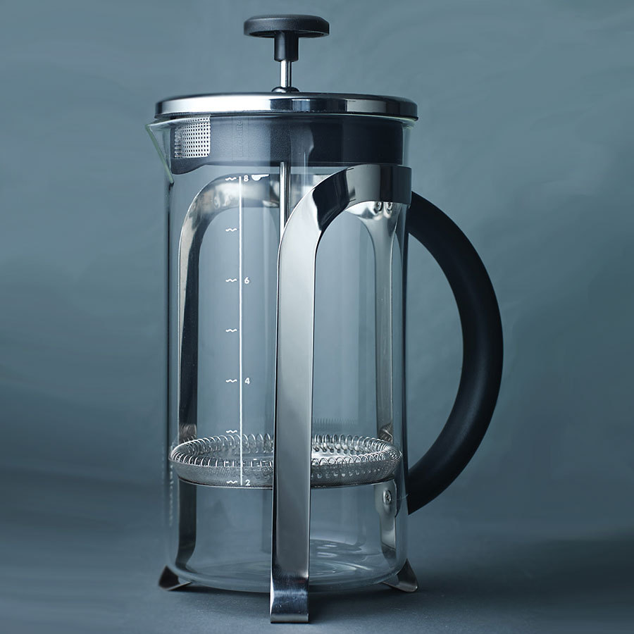 Contemporary design, easy to remove glass beaker from s/s holder. Unique measuring gauge. Microfilter in spout to stop coffee grounds. Beaker is dishwasher safe. Includes measuring spoon.