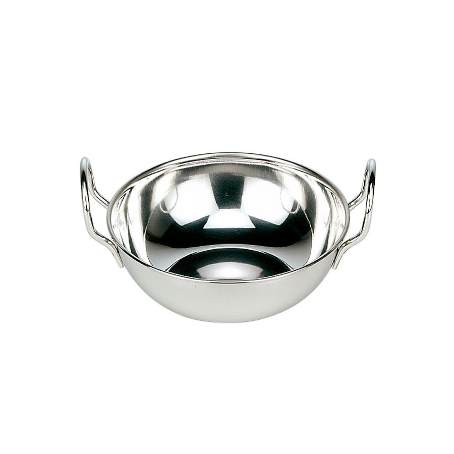 A 22cm diameter stainless steel balti dish – mirror finished with rolled edges, 2 stainless steel handles and a flat base. Perfect for use as a serving dish or a presentation dish.