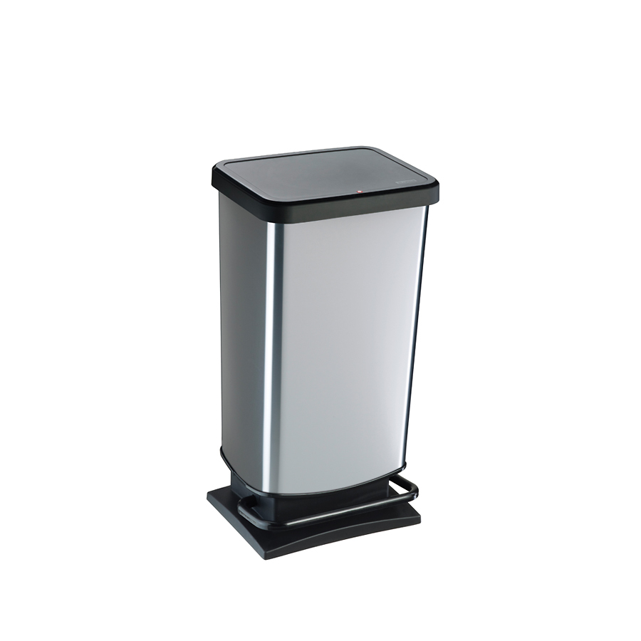 Stylish new plastic design with modern metallic silver effect body and black lid. Lid is slient closing Bag holder ring to secure bag. Secure rubber base. Will not rust, buckle or show fingerprints.