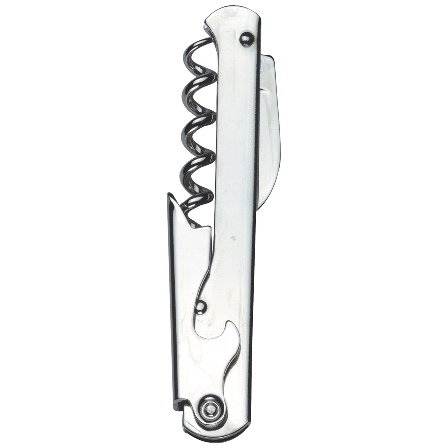 This compact corkscrew consists of a corkscrew, knife and cap remover in one device. Perfect for waiters to keep on their person for table service.